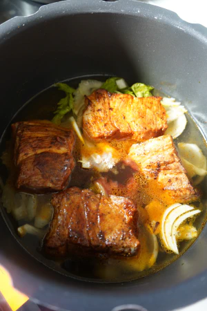 ⑧ 圧力鍋にサラダ油、にんにく(1/2カット済み)を入れ、弱火でにんにくの香りが立つまで加熱する。⑦を入れて強火で肉の両面に焼き色がつくまで加熱し、一度取り出す。